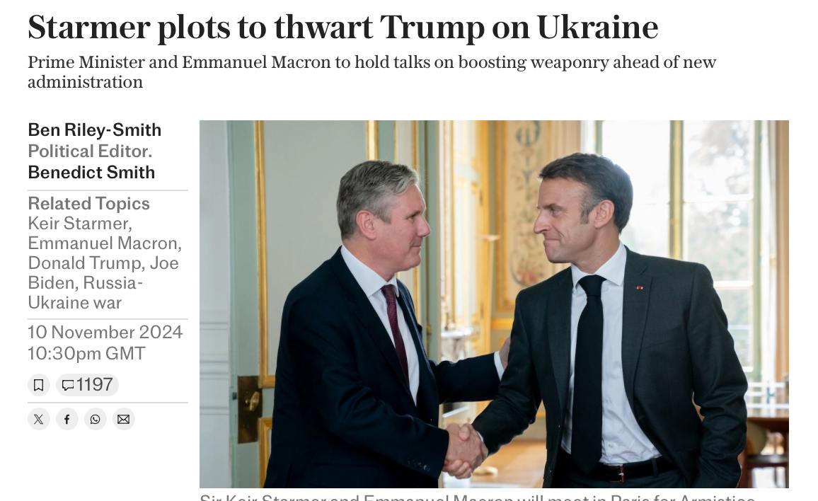 Премьер-министр Великобритании Кир Стармер и президент Франции Эмманюэль Макрон попытаются убедить уходящего главу Белого дома Джо Байдена дать Украине разрешение на стрельбу ракетами Storm Shadow вглубь России до инаугурации нового президента США Дональда Трампа.