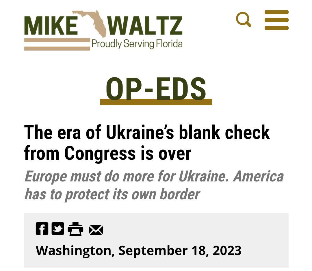 Майкл Уолтц - похожий случай. Летом 2022 года в составе группы конгрессменов он посещал Украину и призывал Байдена направить Киеву больше военной помощи. Но уже в сентябре 2023 года выступил против дальнейшего финансирования Украины, если США и дальше будут нести основные расходы, пока такие европейские страны, как Германия, платят гораздо меньше.