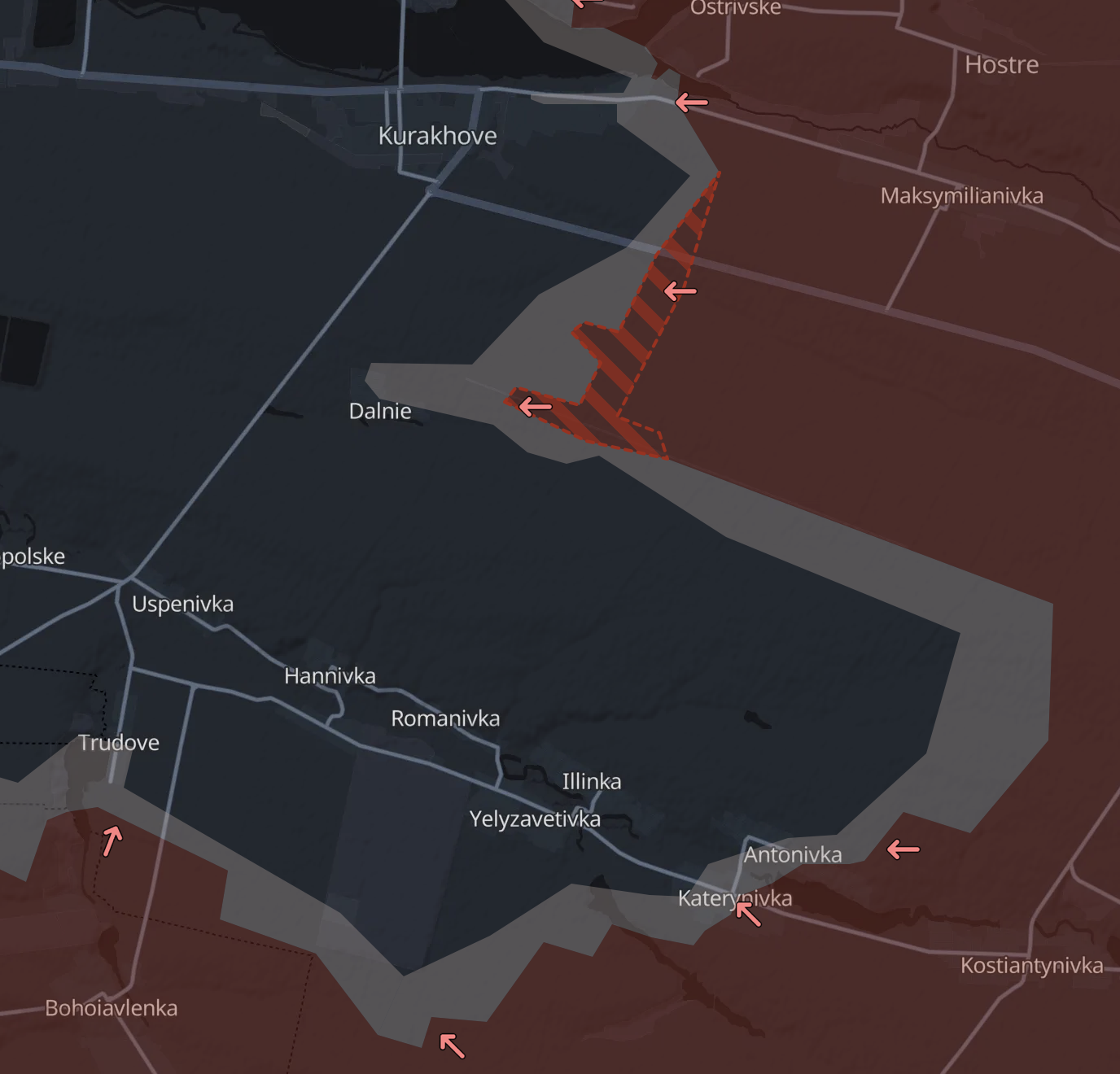 Резко обострилась ситуация к югу от Курахово, где россияне вошли в село Дальнее. Оно выходит прямо на трассу, которая соединяет Курахово с селом Успеновка, и сейчас РФ близка к ее перерезанию - до трассы менее двух километров.