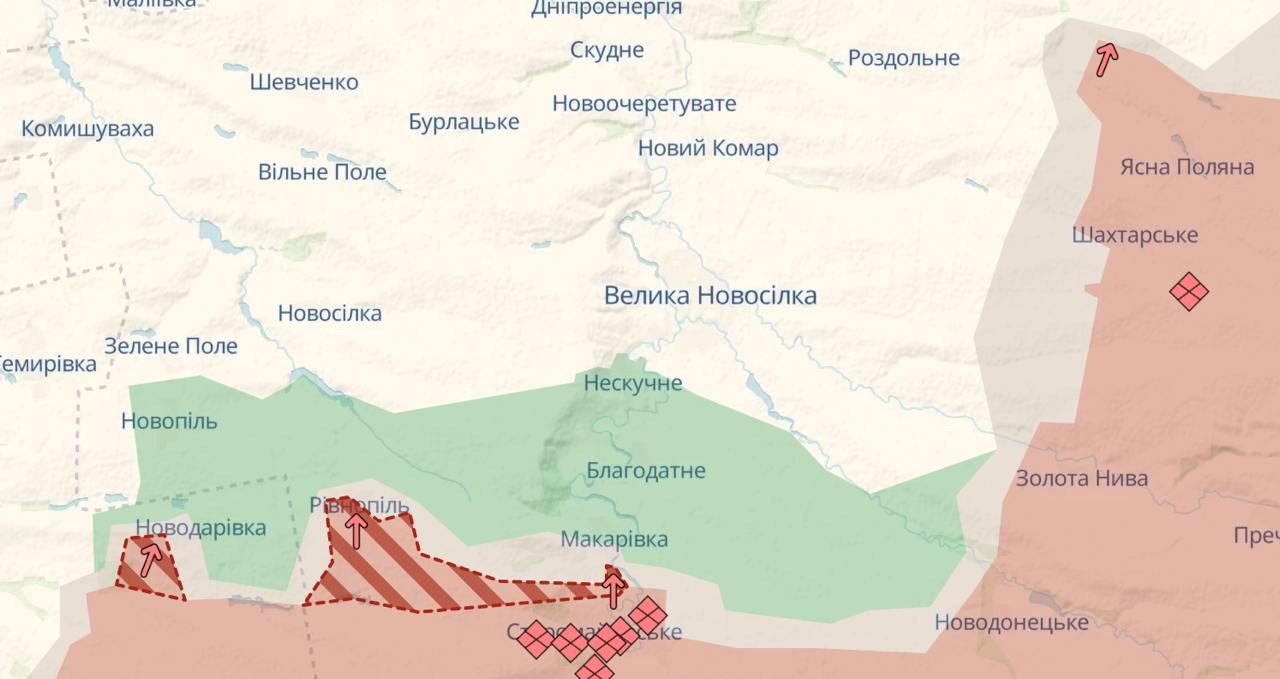 Основное направление движения - с юга к западу от Великой Новосёлки, что может иметь целью обойти город с запада. С востока он уже блокирован российскими войсками. Вчера сообщалось, что российские войска проводят штурмовые действия силами до 50-60 человек за раз, а также при поддержке ББМ и подразделений на багги.