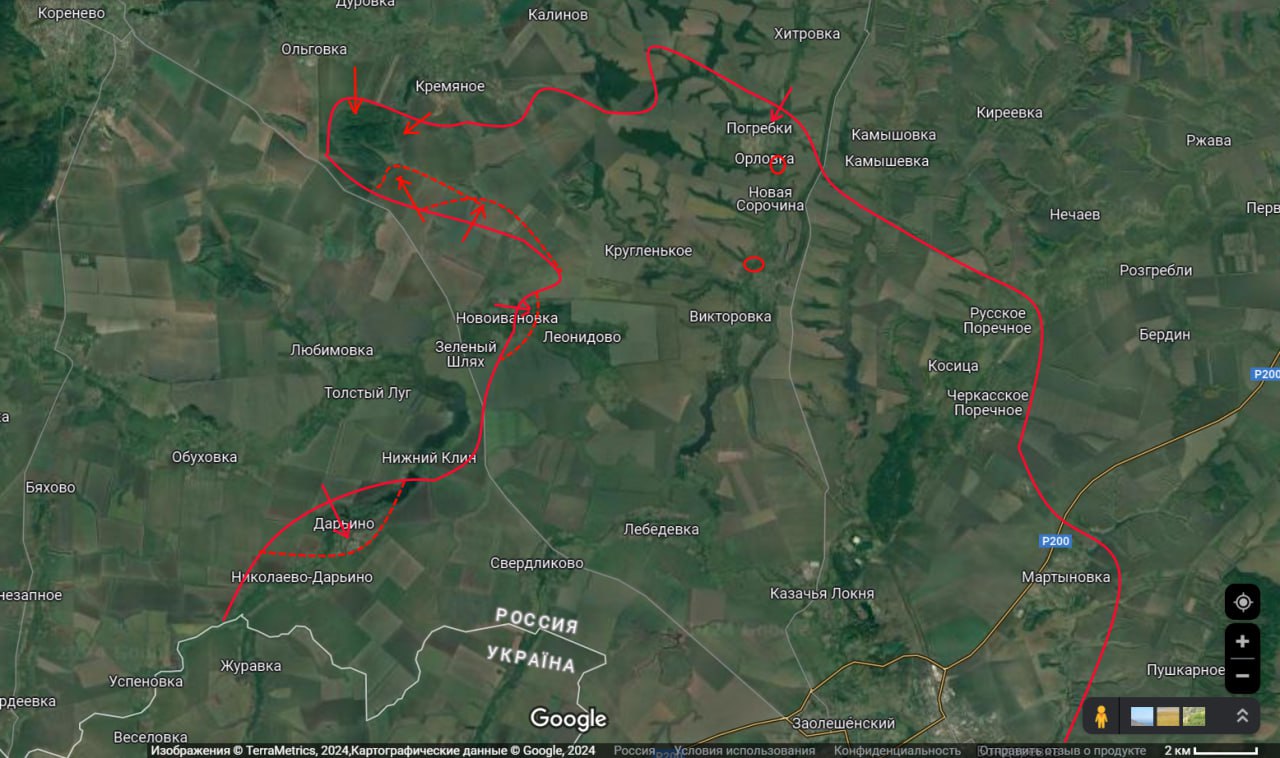 Российские паблики пишут, что практически захватили Дарьино, а также сообщают об атаках своей армии севернее - в лесу под Ольговкой (к востоку от Коренево).