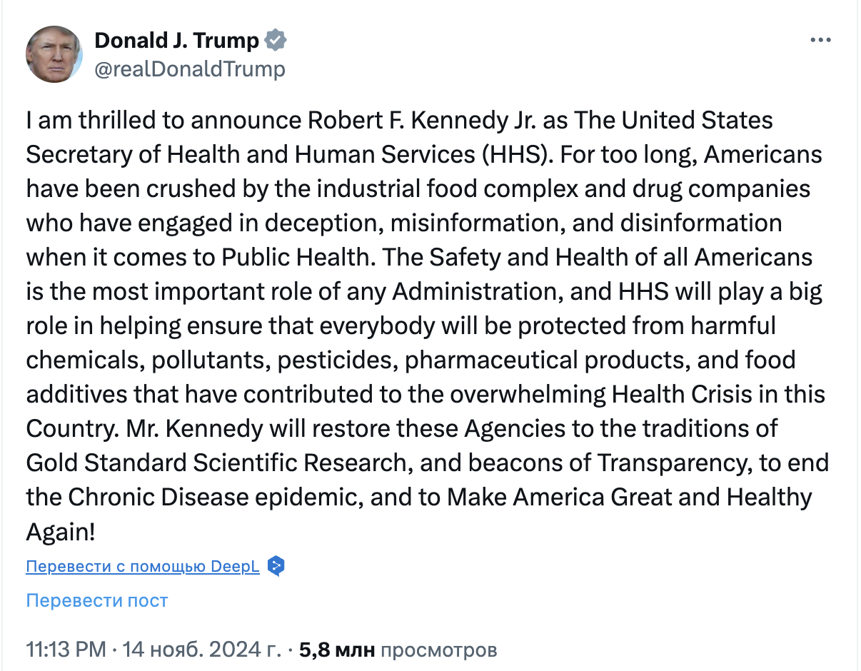 "Я с радостью объявляю Роберта Ф. Кеннеди-младшего министром здравоохранения и социальных служб США. Слишком долго американцы были раздавлены промышленным пищевым комплексом и фармацевтическими компаниями, которые занимались обманом, дезинформацией и дезинформированием, когда речь шла о здоровье населения. Безопасность и здоровье всех американцев - самая важная задача любой администрации, и HHS сыграет большую роль в обеспечении защиты всех от вредных химикатов, загрязняющих веществ, пестицидов, фармацевтической продукции и пищевых добавок, которые способствовали непреодолимому кризису здоровья в этой стране. Г-н Кеннеди вернет эти ведомства к традициям золотых стандартов научных исследований и маяков прозрачности, чтобы положить конец эпидемии хронических заболеваний и сделать Америку снова великой и здоровой!" - написал Трамп в Х.