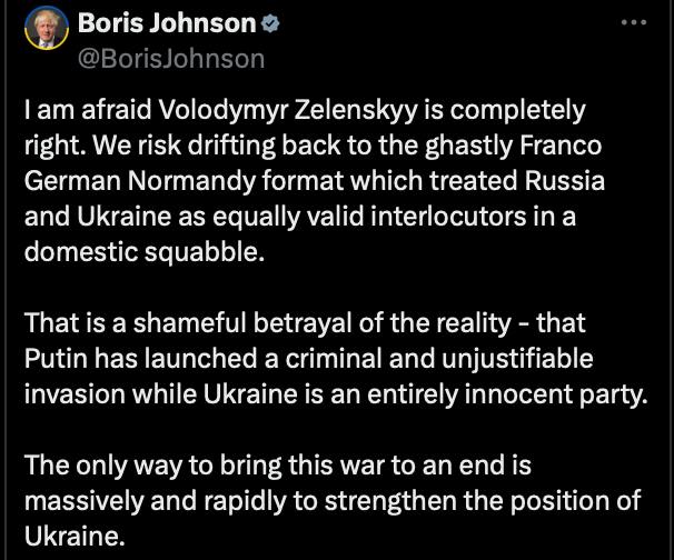 Джонсон считает это "позорным предательством реальности" и предлагает вместо переговоров с Россией "масштабно и быстро укрепить позиции Украины".