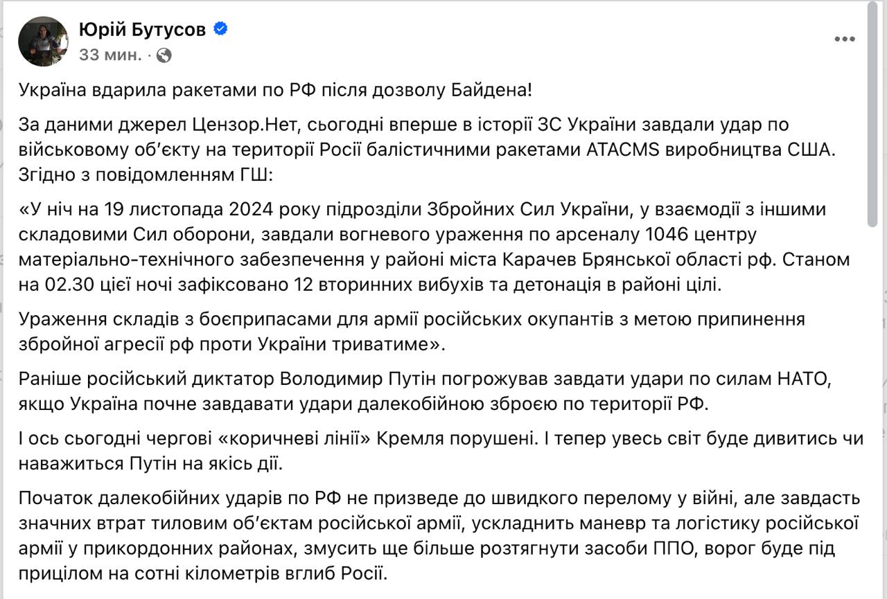 11.08 Украина сегодня уже ударила американскими ракетами ATACMS по территории РФ, сообщает главред "Цензор.нет" Юрий Бутусов со ссылкой на источники.