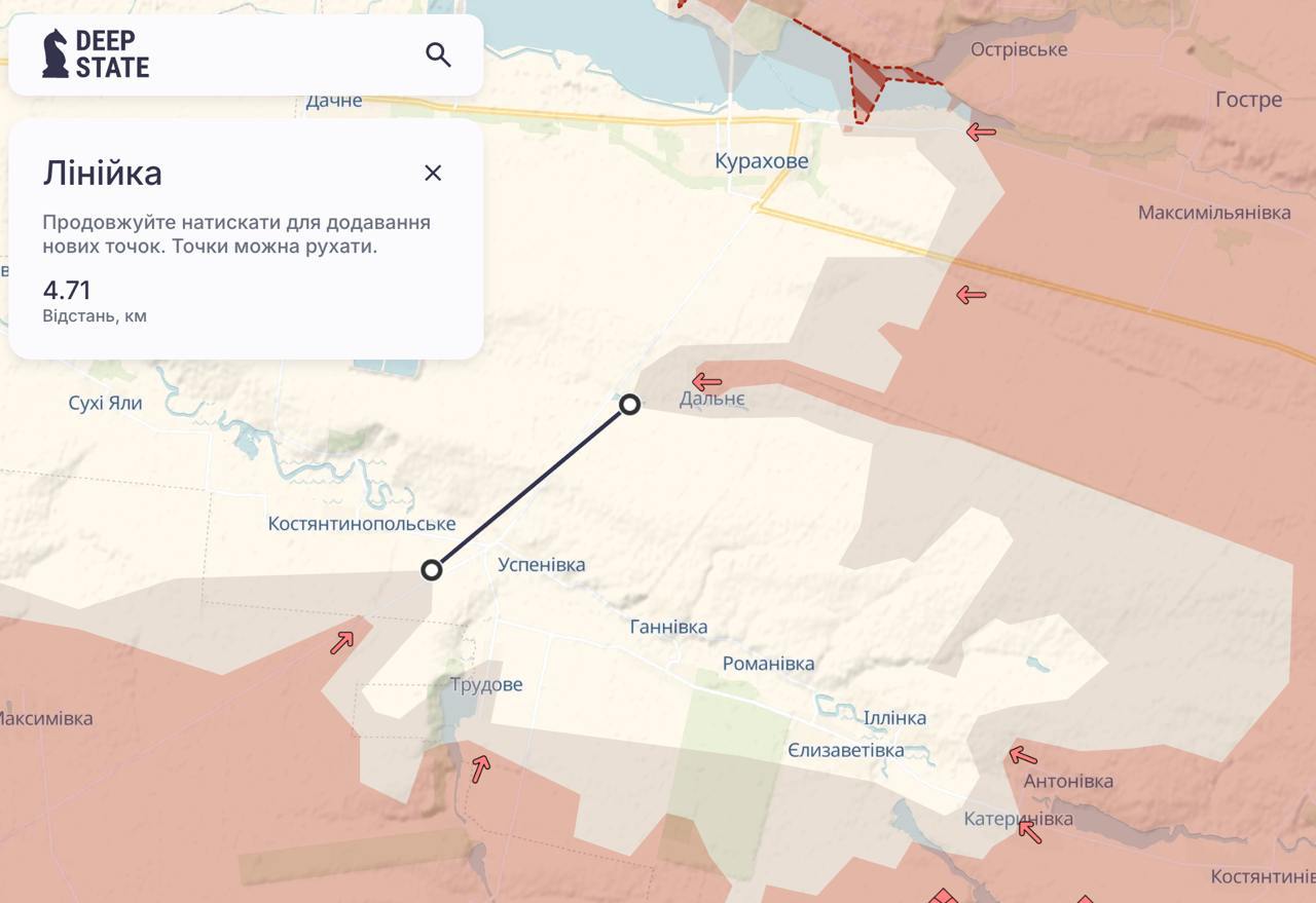 14.56 Меньше 5 км осталось до окружения ВСУ южнее Курахово, свидетельствует карта Deep State.