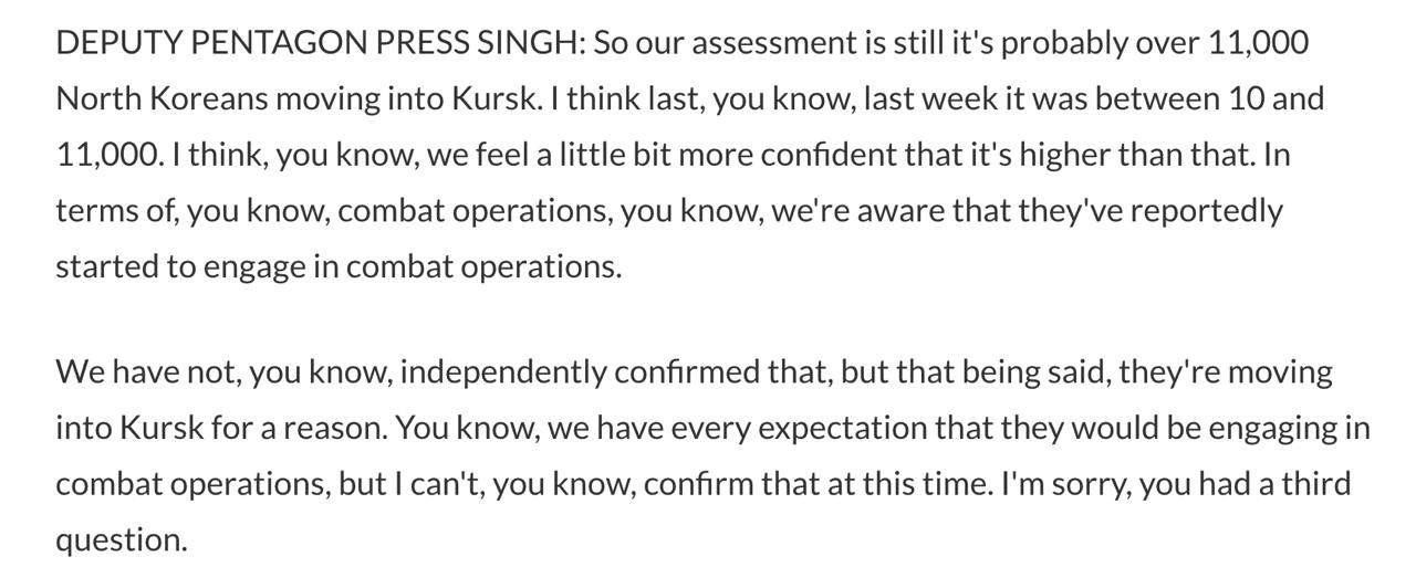 "Мы знаем, что они, как сообщается, начали участвовать в боевых операциях. Мы не получили независимого подтверждения этого, но они направляются в Курск по какой-то причине. У нас есть все основания полагать, что они будут участвовать в боевых действиях, но я не могу подтвердить это в данный момент", - заявила на брифинге представителя Минобороны Сабрина Сингх.