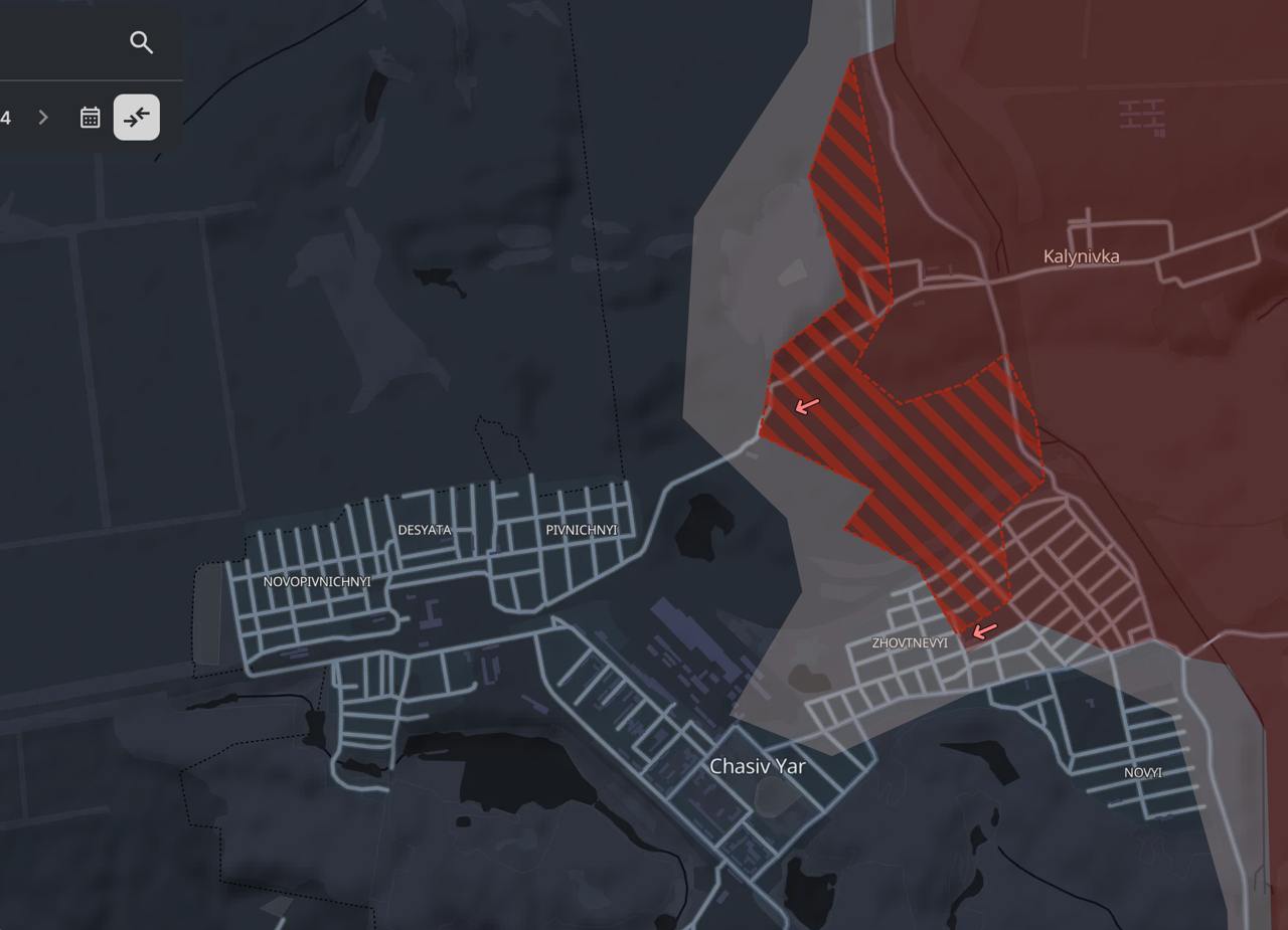 Кроме того, по данным Deep State, за минувшие сутки российские войска продвинулись в Донецкой области не только в Часове Яре, но и в соседней Калиновке, а также Торецке, Курахово, Берестках, под Юрьевкой и Раздольным (в направлении Великой Новоселки). Зафиксировано продвижение и у Погребков Курской области РФ.