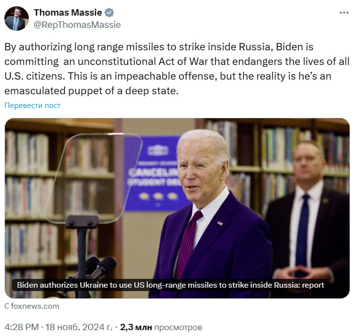 "Разрешая наносить удары по территории России дальнобойными ракетами, Байден совершает антиконституционный акт войны, который ставит под угрозу жизни всех граждан США. Это заслуживающее импичмента преступление, но реальность такова, что он – просто лишенная воли марионетка глубинного государства", – написал конгрессмен.