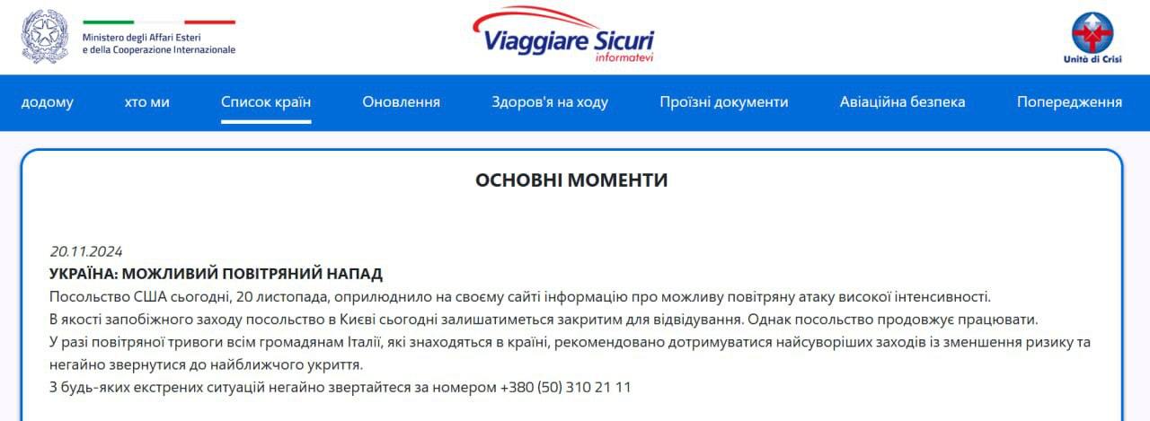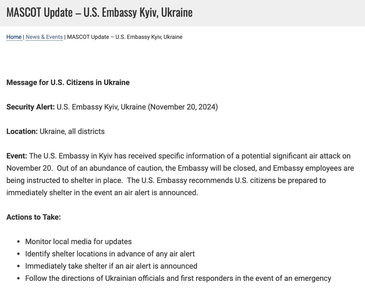 "Посольство США в Киеве получило конкретную информацию о потенциальной значительной воздушной атаке 20 ноября. В качестве меры предосторожности посольство будет закрыто, а его сотрудникам даны указания укрыться на месте. Посольство США рекомендует гражданам США быть готовыми немедленно укрыться в случае объявления воздушной тревоги", - говорится в объявлении на сайте представительства.