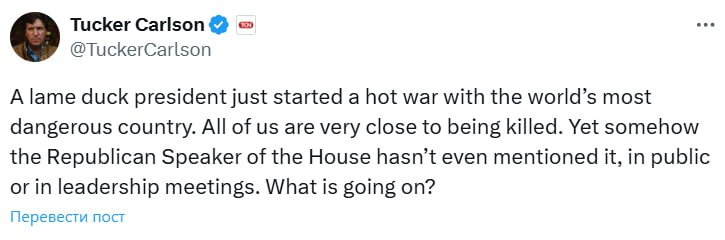 "Президент-хромая утка только что начал горячую войну с самой опасной страной в мире. Все мы очень близки к тому, чтобы быть убитыми. Однако каким-то образом республиканский спикер Палаты представителей даже не упомянул об этом, публично или на собраниях руководства. Что происходит?" – написал Карлсон в Х.