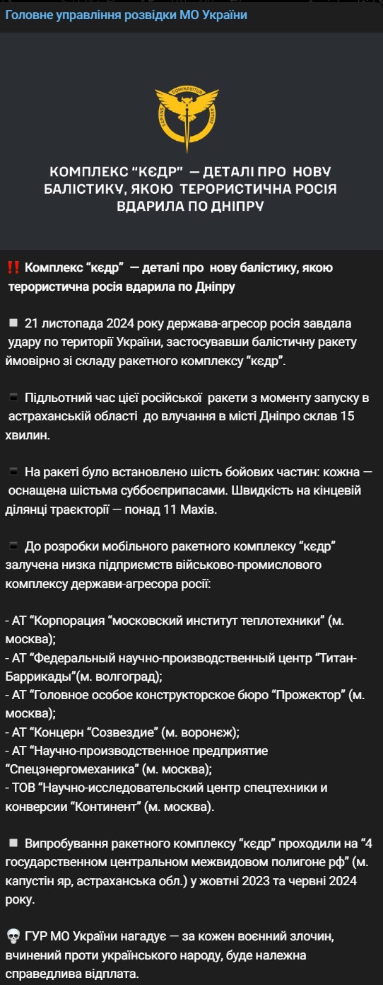 Вчера, 21 ноября, Россия ударила по Днепру баллистической ракетой, вероятно из состава ракетного комплекса "Кедр".