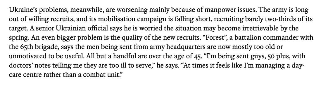 "В армии давно нет добровольцев, а мобилизационная кампания не справляется, набирая едва ли две трети от своей цели. Высокопоставленный украинский чиновник говорит, что он обеспокоен тем, что ситуация может стать непоправимой к весне", - пишет журнал.