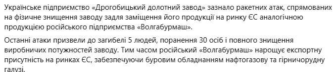 Он отметил, что последние атаки на долотный завод в Дрогобыче привели к гибели 5 и ранению 30 человек, а также полному уничтожению производственных мощностей.