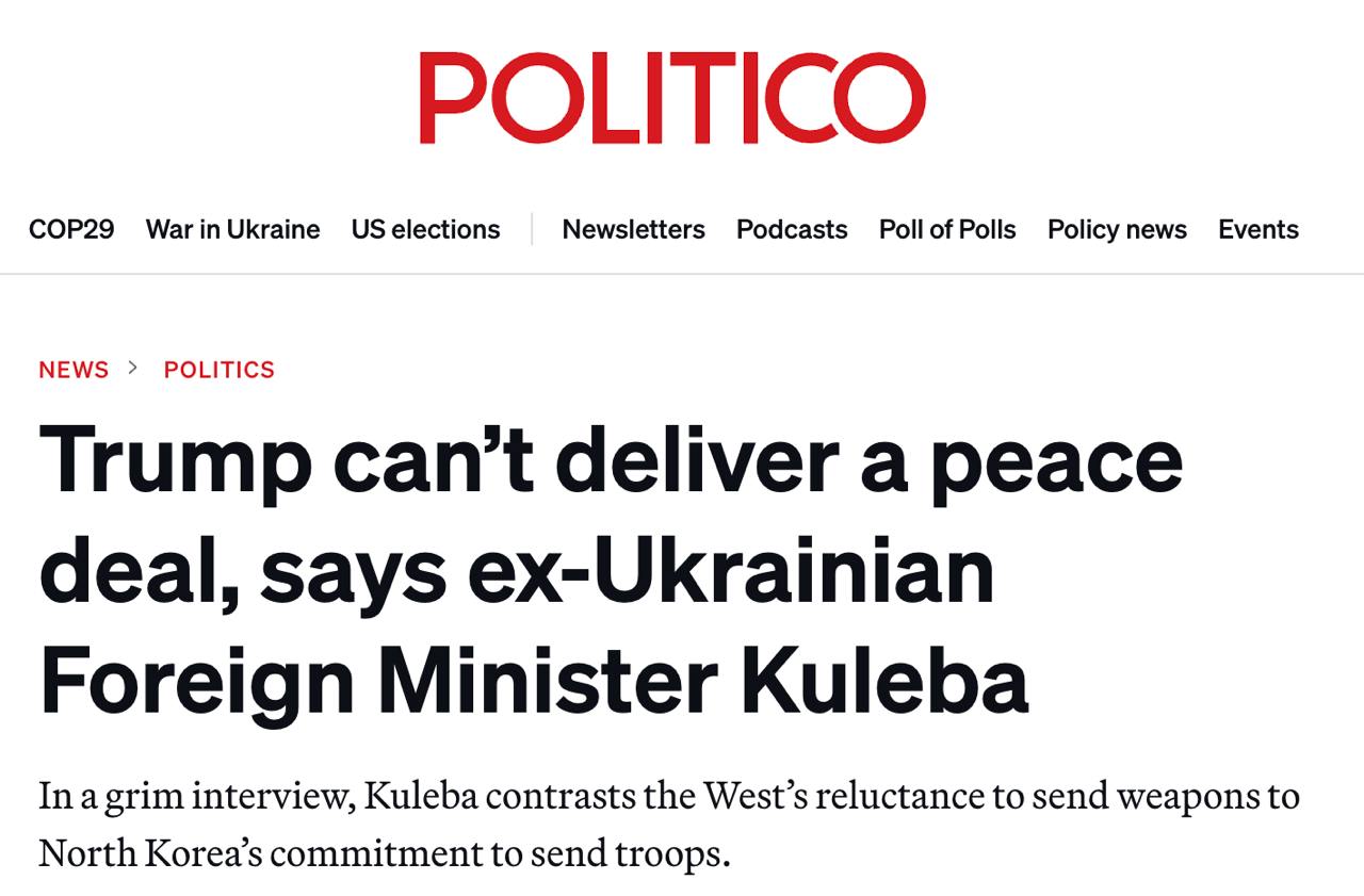 Он опасается, что Трамп "посадит Украину на голодный паек, чтобы сделать ее более послушной, если его мирная попытка пойдет наперекосяк", что Кулеба считает вполне вероятным.