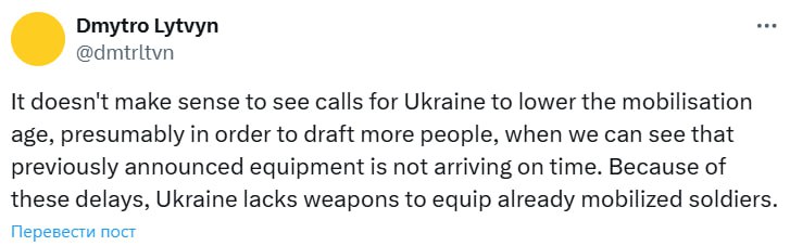 "Не имеет смысла призывать Украину снизить призывной возраст, предположительно для того, чтобы призвать больше людей, когда мы видим, что ранее объявленное оборудование не поступает вовремя. Из-за этих задержек у Украины не хватает оружия для оснащения уже мобилизованных солдат", – написал Литвин в Х.