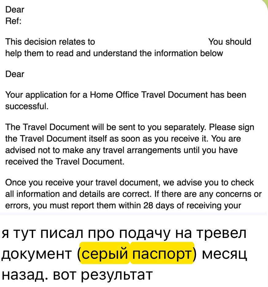 "Я тут писал о подаче на тревел-документ ("серый паспорт") месяц назад. Вот результат", - делится один из пользователей соцсетей, прилагая письмо от британских властей, что ему одобрили выдачу "серого паспорта".