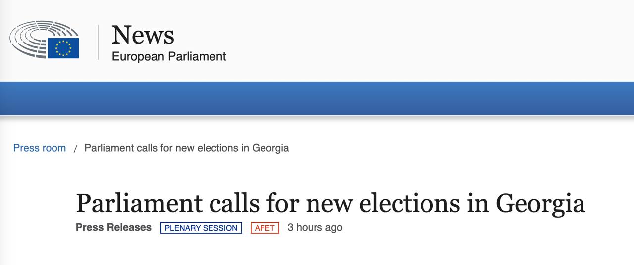 В резолюции отмечается, что состоявшиеся в середине ноября выборы "не были ни свободными, ни справедливыми, представляют собой еще одно проявление продолжающегося отката страны от демократии, за который правящая партия "Грузинская мечта" несет полную ответственность". Евродепутаты считают, что на выборах было много серьезных нарушений, а потому они не репрезентативны.