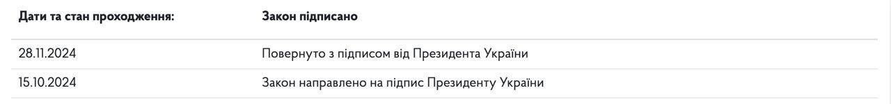 "Возвращен с подписью от президента Украины", - сказано на сайте.