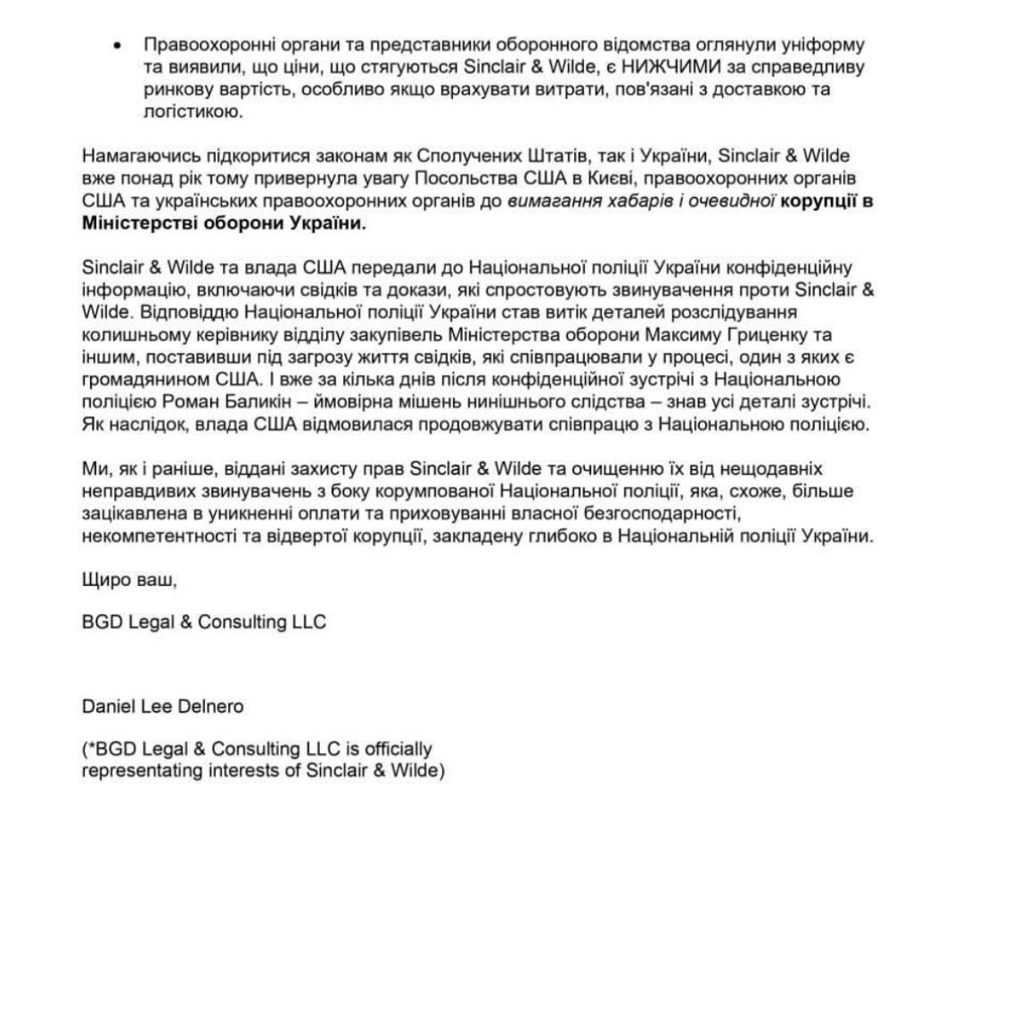 "Sinclair & Wilde категорически отрицает ложные и безосновательные заявления, сделанные в недавно обнародованном видео Национальной полицией Украины. Очевидно, что обнародование этой истории является попыткой Национальной полиции скрыть собственную внутреннюю коррупцию и коррумпированность Министерства обороны Украины в его длительных попытках отказаться от оплаты после того, как она неоднократно отказывалась платить взятки, которые от нее требовали", - говорится в открытом письме.