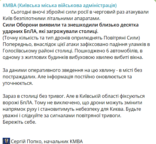 В результате этой атаки зафиксировано падение обломков в Голосеевском районе столицы. Повреждены 6 автомобилей, в одном из жилых домов взрывной волной выбиты окна.