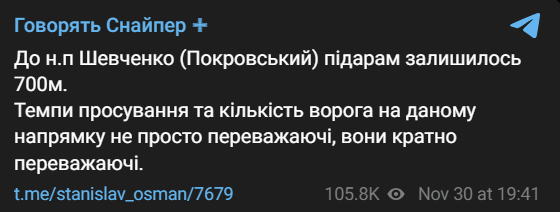 Ранее украинские военные сообщали, что россияне хотят, двигаясь к югу от Покровска, обойти город и отрезать его с запада.