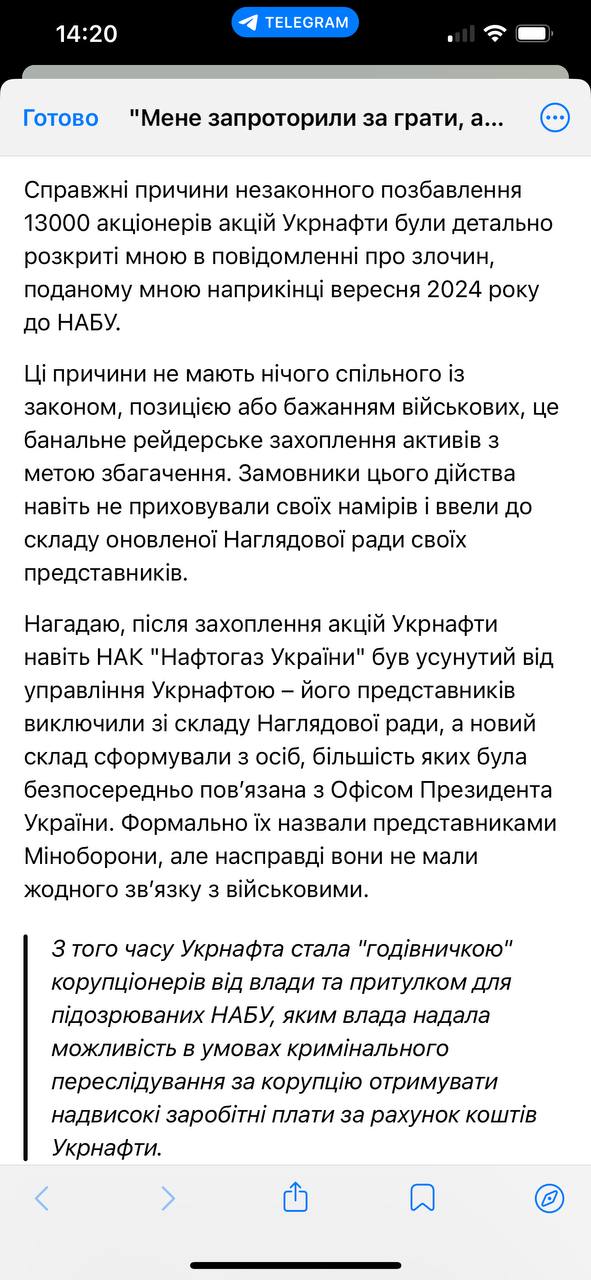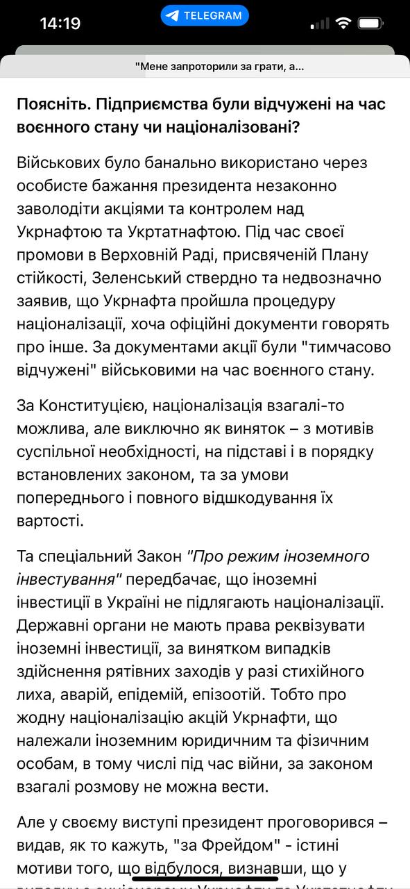 Коломойский утверждает, что проведенное в конце 2022 года отчуждение акций "Укрнафты" и "Укртатнафты" у их частных акционеров (это было оформлено решением Ставки как передачу акций в распоряжение армии) было осуществлено из-за желания Зеленского взять под контроль компанию.