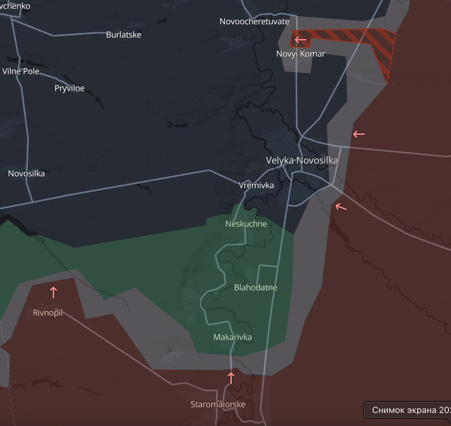 В районе Великой Новоселки российские войска прорвались в населенный пункт Новый Комар. Это фактически блокирует город с северной стороны, если Новый Комар удастся захватить. Пока, по данным военного паблика Deep State, идут попытки выбить россиян оттуда.