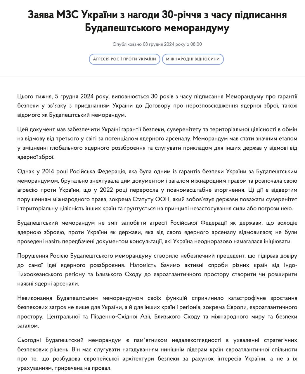 Об этом говорится в заявлении Министерства иностранных дел Украины по случаю 30-й годовщины подписания Будапештского меморандума, которое было распространено на министерской встрече стран НАТО.
