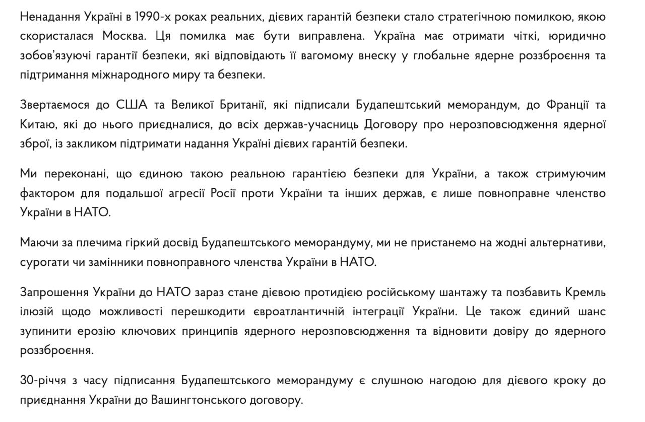 Украина обращается с призывом пригласить ее в Альянс к США и Великобритании, которые подписали Будапештский меморандум, Франции ​​и Китаю, которые к нему присоединились, а также ко всем государствам-участникам Договора о нераспространении ядерного оружия.
