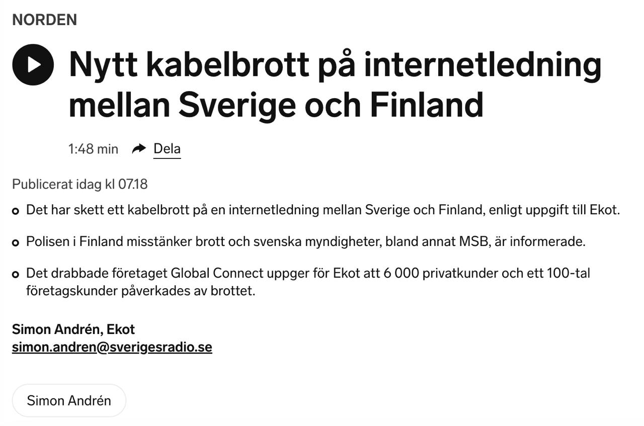Между Швецией и Финляндией произошли новые обрывы интернет-кабелей. На этот раз не в воде, а на суше - около городов Эспоо и Вихти.