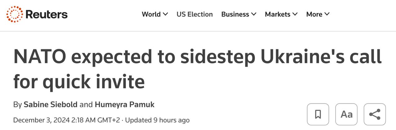 А Reuters со ссылкой на источники пишет, что НАТО "вряд ли прислушается к призыву Украины о приглашении вступить в Альянс" на сегодняшней встрече министров иностранных дел. По данным издания, "нет никаких признаков необходимого консенсуса" среди 32 членов НАТО, что "разбивает надежды Киева на политический подъем".