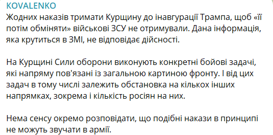 "Никаких приказов удерживать Курскую область до инаугурации Трампа, чтобы "ее потом обменять", военные ВСУ не получали. Данная информация, крутящаяся в СМИ, не соответствует действительности", – утверждает Коваленко.