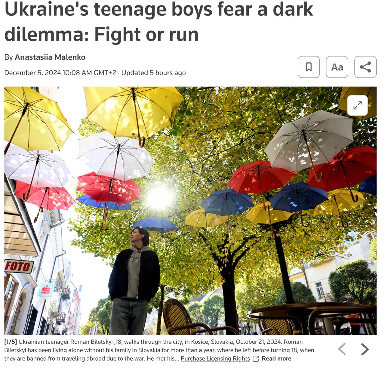 Оно приводит истории Романа Билецкого, который предпочел уехать в Словакию учиться управлению бизнесом, и Андрея Котика, который пошел в армию в 2022 году, когда ему исполнилось 18.