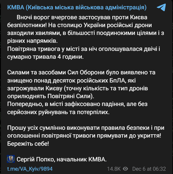 08:15 Ночью было обнаружено и уничтожено более десятка российских БПЛА, угрожавших Киеву. Об этом сообщает КГВА.