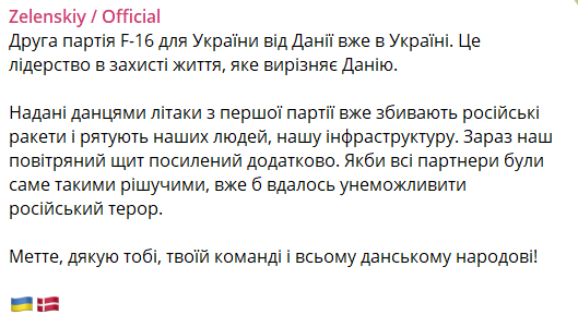 "Вторая партия F-16 для Украины от Дании уже в Украине. Это лидерство в защите жизни, отличающее Данию", - написал он.
