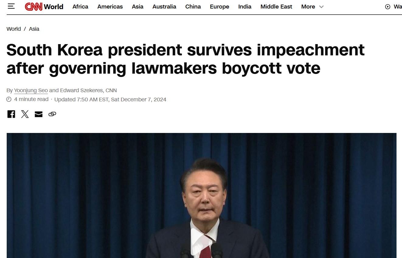 Парламент Южной Кореи не смог отправить в отставку президента страны Юн Сок Ёля после его провальной попытки ввести в стране военное положение.