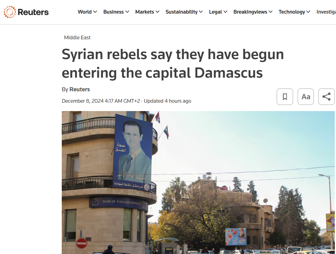 Сирийские повстанцы заявили в воскресенье, 8 декабря, что начали входить в столицу Дамаск, в которой не было каких-либо признаков развертывания армии.