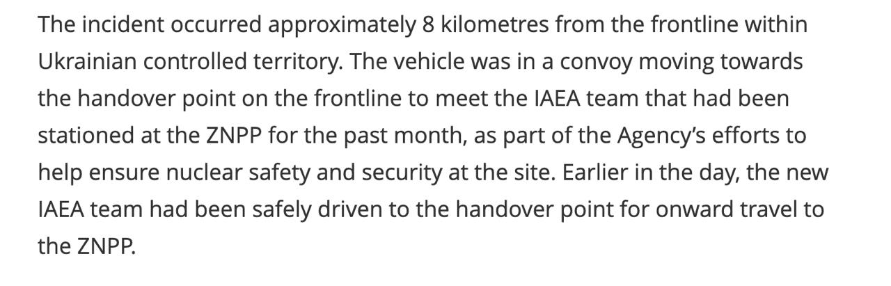 При этом МАГАТЭ уже официально подтвердило, что автомобиль был атакован на территории, подконтрольной Украине - примерно в 8 км от линии фронта. Ни к одной из сторон агентство обвинений не выдвигало.