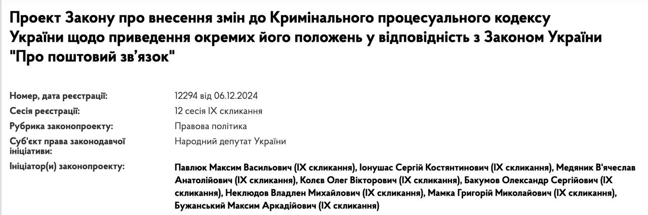 Карточка проекта закона под названием "О внесении изменений в Уголовный процессуальный кодекс Украины о приведении отдельных его положений в соответствие с законом Украины "О почтовой связи" опубликована на сайте парламента.