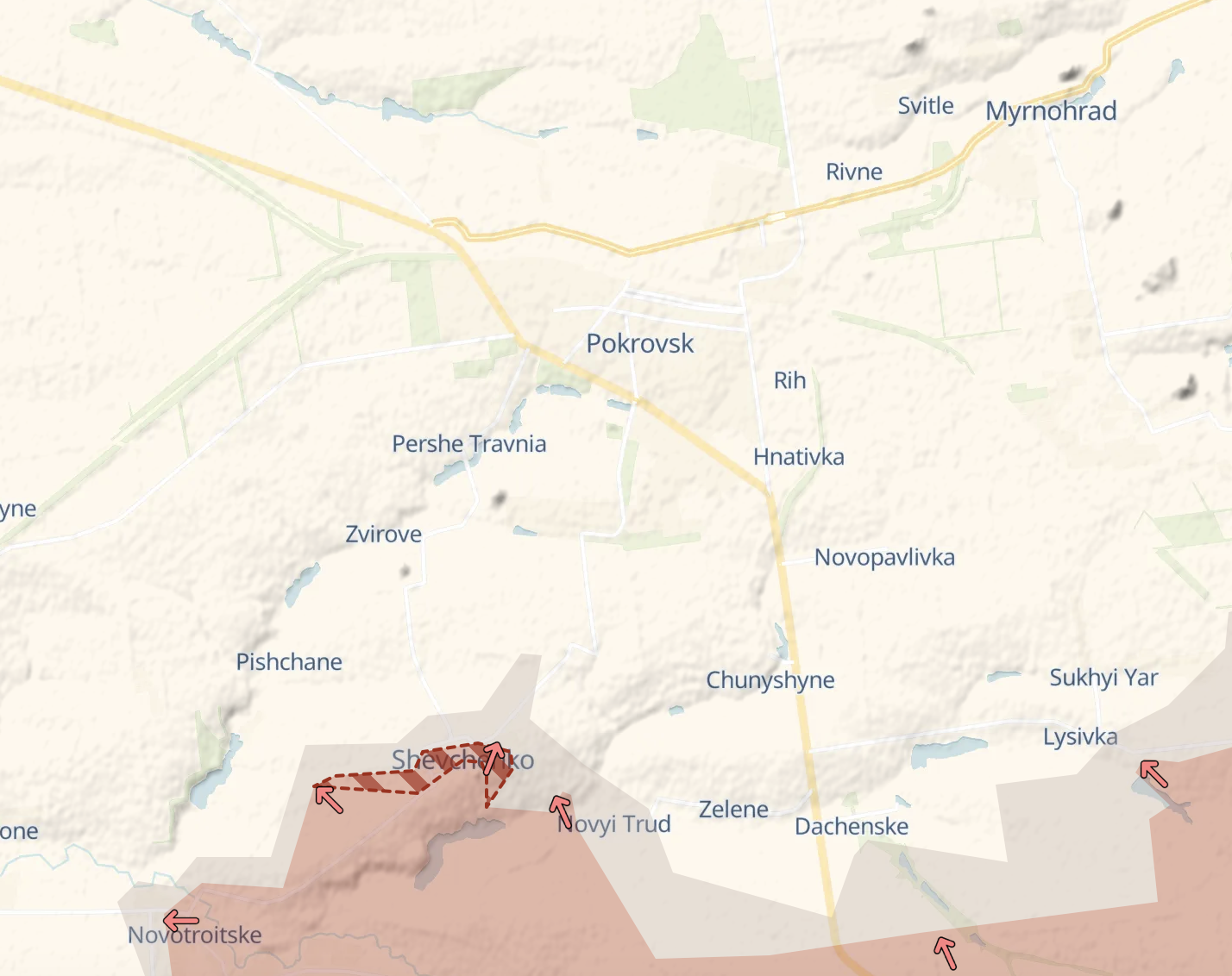 Российские войска уже менее и ем в двух километрах от южных окраин Покровска в Донецкой области. Согласно карте Deep State, линия боев переместилась к северу от села Шевченко, которое было захвачено РФ.