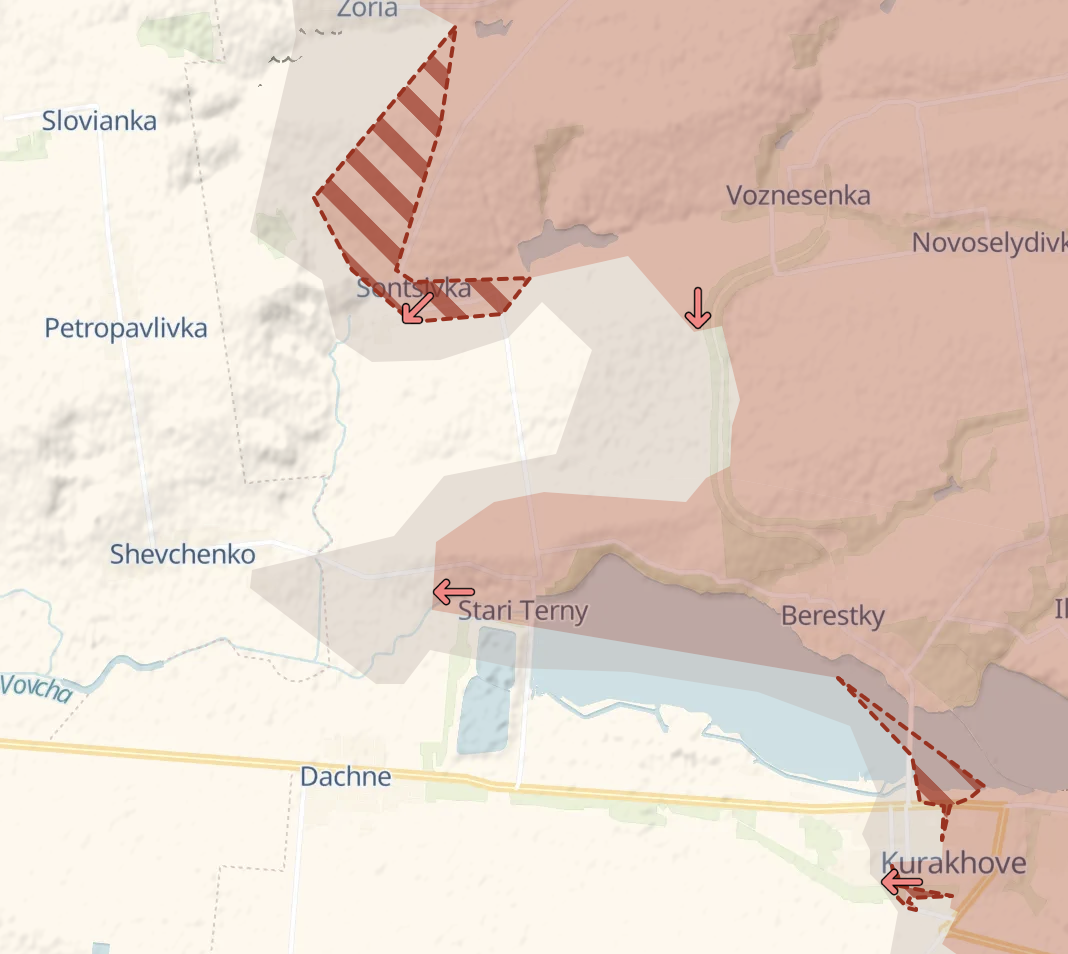 К западу от Курахово бои начались в селе Шевченко (западнее Старых Тернов). Также в этом районе практически полностью захвачена Сонцовка.