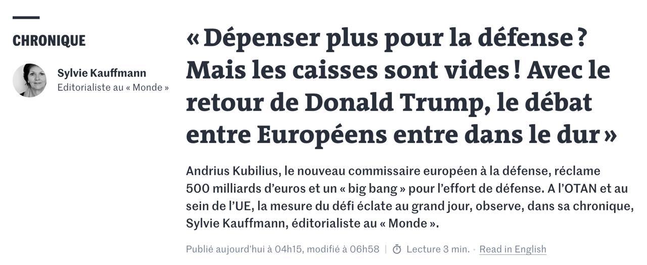 "Вопрос финансирования резкого увеличения оборонных усилий выходит за рамки поддержки Украины. Он касается того, как Европа может - или не может - обеспечить собственную безопасность в абсолютно нестабильном мире без автоматической гарантии защиты со стороны Соединенных Штатов. Речь также идет о ее участии в любом соглашении между США, Россией и Украиной, которое неизбежно будет иметь последствия для безопасности континента. Если европейцы хотят видеть себя за столом переговоров о прекращении огня в Украине, они должны что-то принести за этот стол. Трамп не пригласит их спонтанно, а Путин не хочет их там видеть", - комментирует Le Monde.