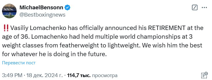 "Василий Ломаченко официально объявил о своем уходе из спорта в возрасте 36 лет. Ломаченко неоднократно становился чемпионом мира в трех весовых категориях - от полулегкого до легкого веса", - написал Бенсон.