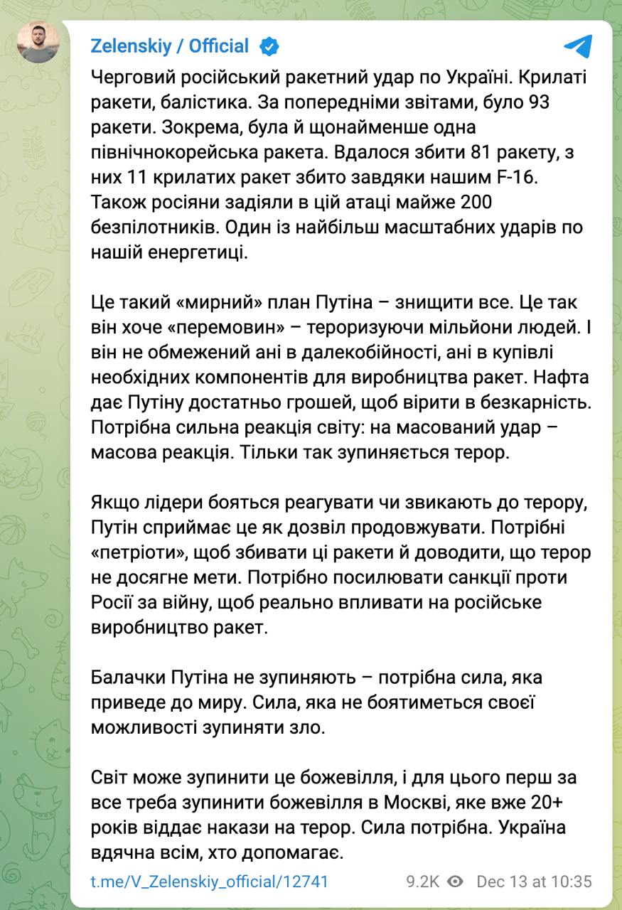 "Один из самых масштабных ударов по нашей энергетике. Это такой "мирный" план Путина – уничтожить все. Это так он хочет "переговоров" – терроризируя миллионы людей", - написал он.
