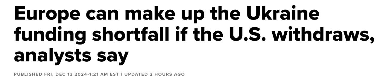 Остальные способы, которые видят эксперты, связаны с ростом затрат стран Европы. Телеканал напоминает, что с января 2022 года по октябрь 2024 года, Европа выделила 241 миллиард евро помощи, а США - 119 миллиардов евро. Из этой суммы фактически передано 125 миллиардов евро из Европы и 88 миллиардов из США.