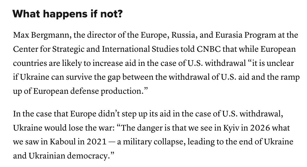 По мнению Бергманна, "неясно, сможет ли Украина пережить разрыв между прекращением американской помощи и наращиванием европейского оборонного производства".
