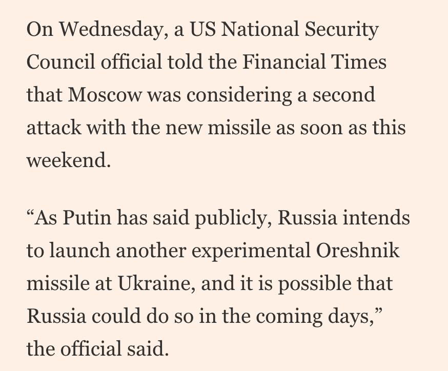 "Как Путин публично заявил, Россия намерена запустить еще одну экспериментальную ракету "Орешник" по Украине, и вполне возможно, что Россия сделает это в ближайшие дни", - заявил источник в среду.