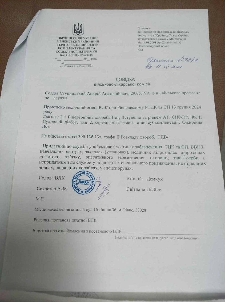 Канал также опубликовал заключение военной медкомиссии с диагнозами священника. Несмотря на них, Ступницкого признали годным к службе в частях обеспечения, ТЦК и подразделениях логистики.