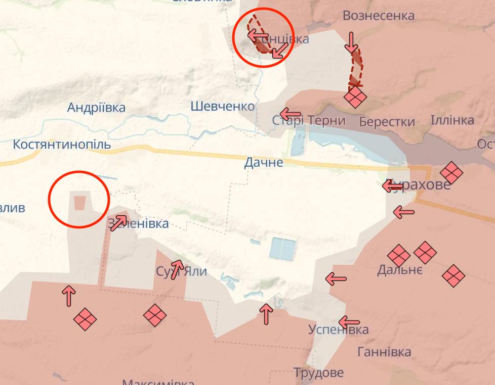 Карта Deep State свидетельствует, что россияне захватили Сонцовку на северном фланге, а на южном заняли участок в поле северо-западнее Зеленовки, примерно в двух километрах от трассы на Курахово. Также российские паблики сегодня заявили о захвате Успеновки в районе бывшего "мешка" (Украина этого не подтверждала).