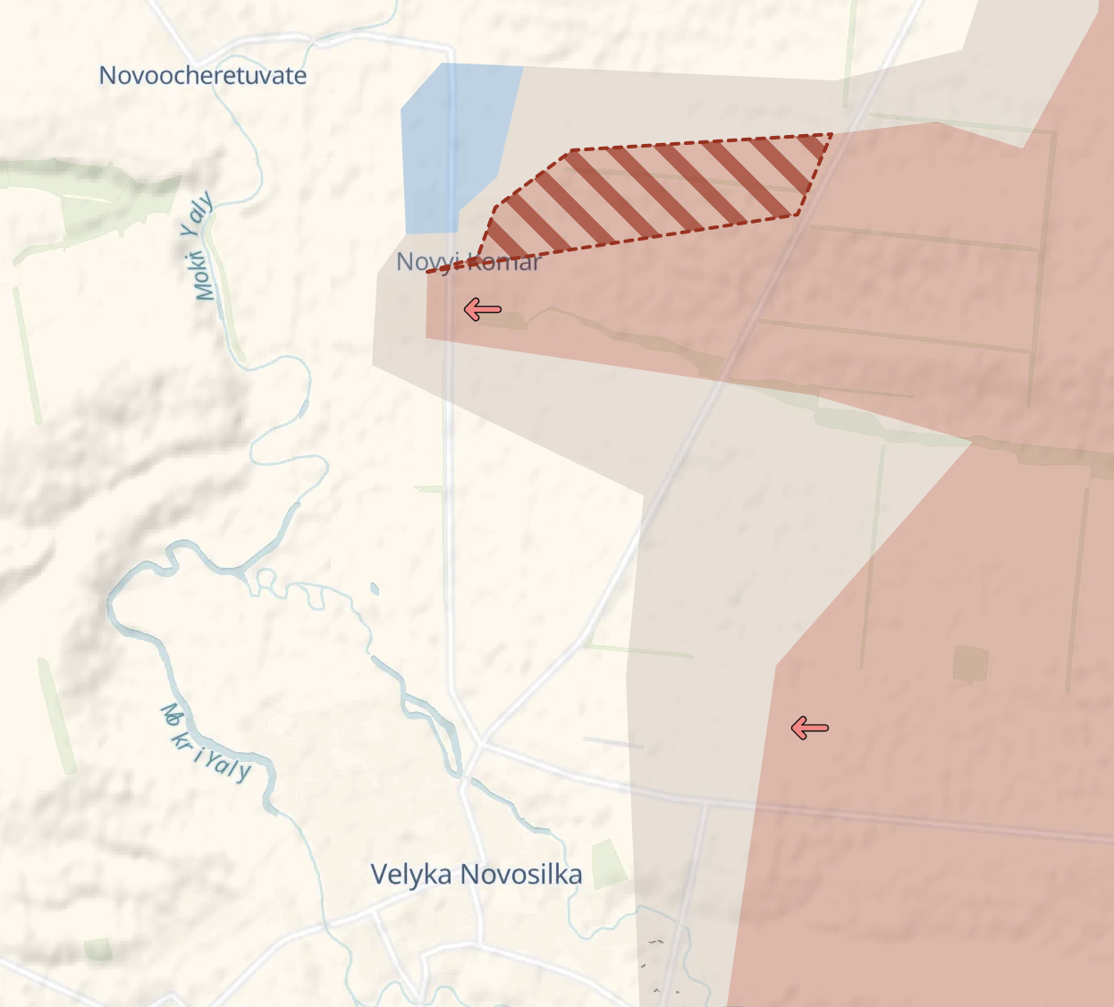 Так, лейтенант ВСУ с позывным "Алекс" пишет, что в Новом Комаре севернее Великой Новоселки идет бой, южнее – в районе Благодатного – россияне "имеют продвижение". По карте Deep State, за минувшие сутки россияне увеличили зону присутствия вокруг Нового Комара.
